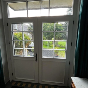 Cette porte se compose de deux vantaux, offrant ainsi une grande ouverture. Ces deux vantaux sont agrémentés d'impostes et de petits bois pour apporter davantage de luminosité à l'entrée.
