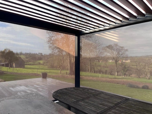 Afin de maximiser le confort d'utilisation, l'agence de Saint-Lô a équipé cette pergola de stores latéraux et frontaux intégrés. Ces équipements sont essentiels en Normandie pour couper les vents frais et protéger l'intimité du foyer sans occulter la vue. L'installation, réalisée par les techniciens Logikinov, garantit une robustesse à toute épreuve face aux vents du bocage virois.
