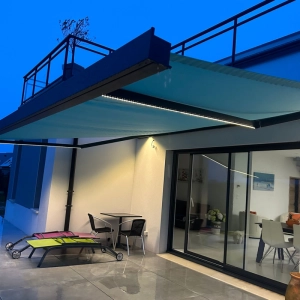 Le premier store mesure 5,50m par 3,75m tandis que le second mesure 4,25m par 3,50m d’avancée. Et pour prolonger les soirées d’été une fois la nuit tombée, des LEDs sont installés dans les bras des stores.